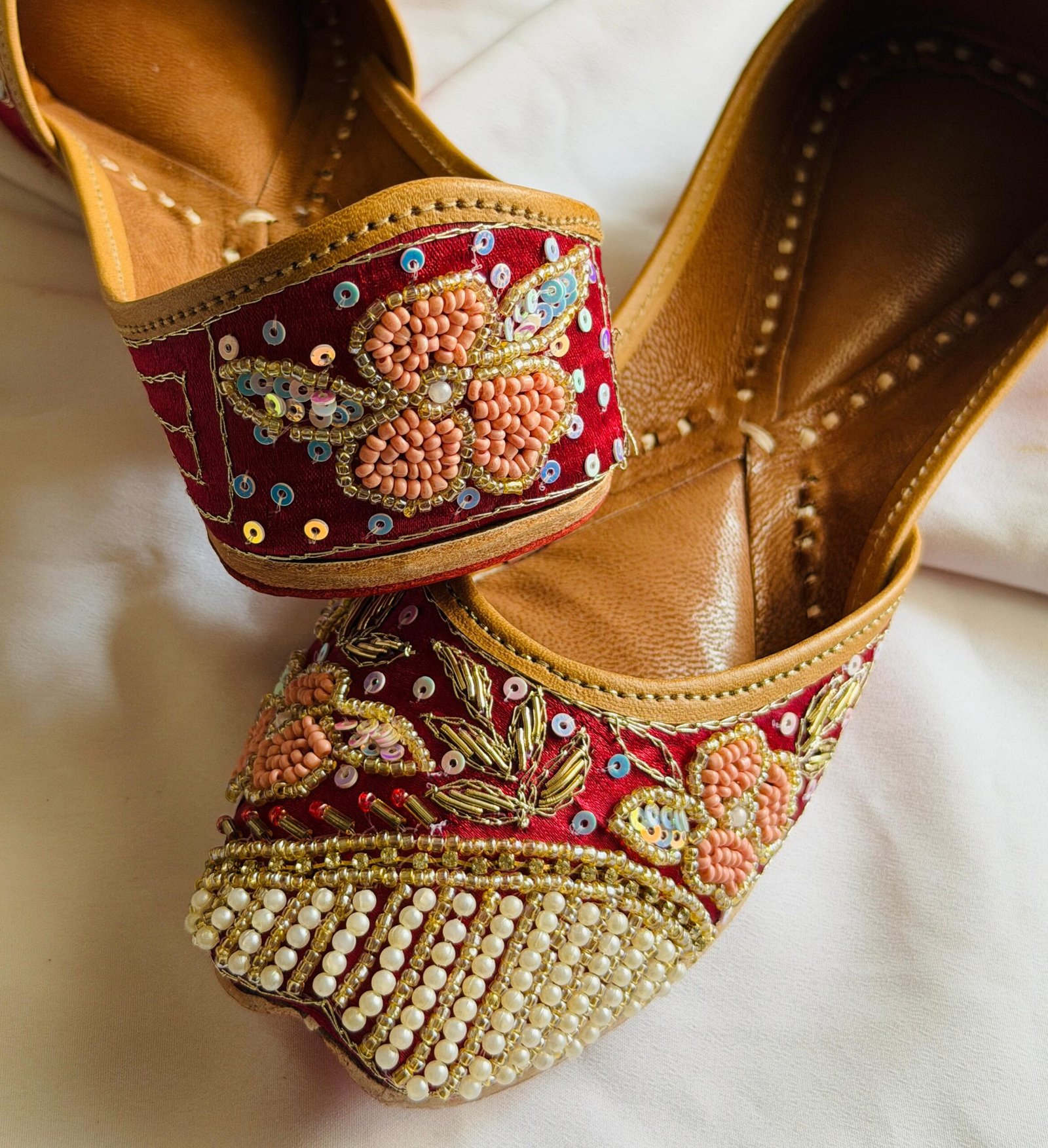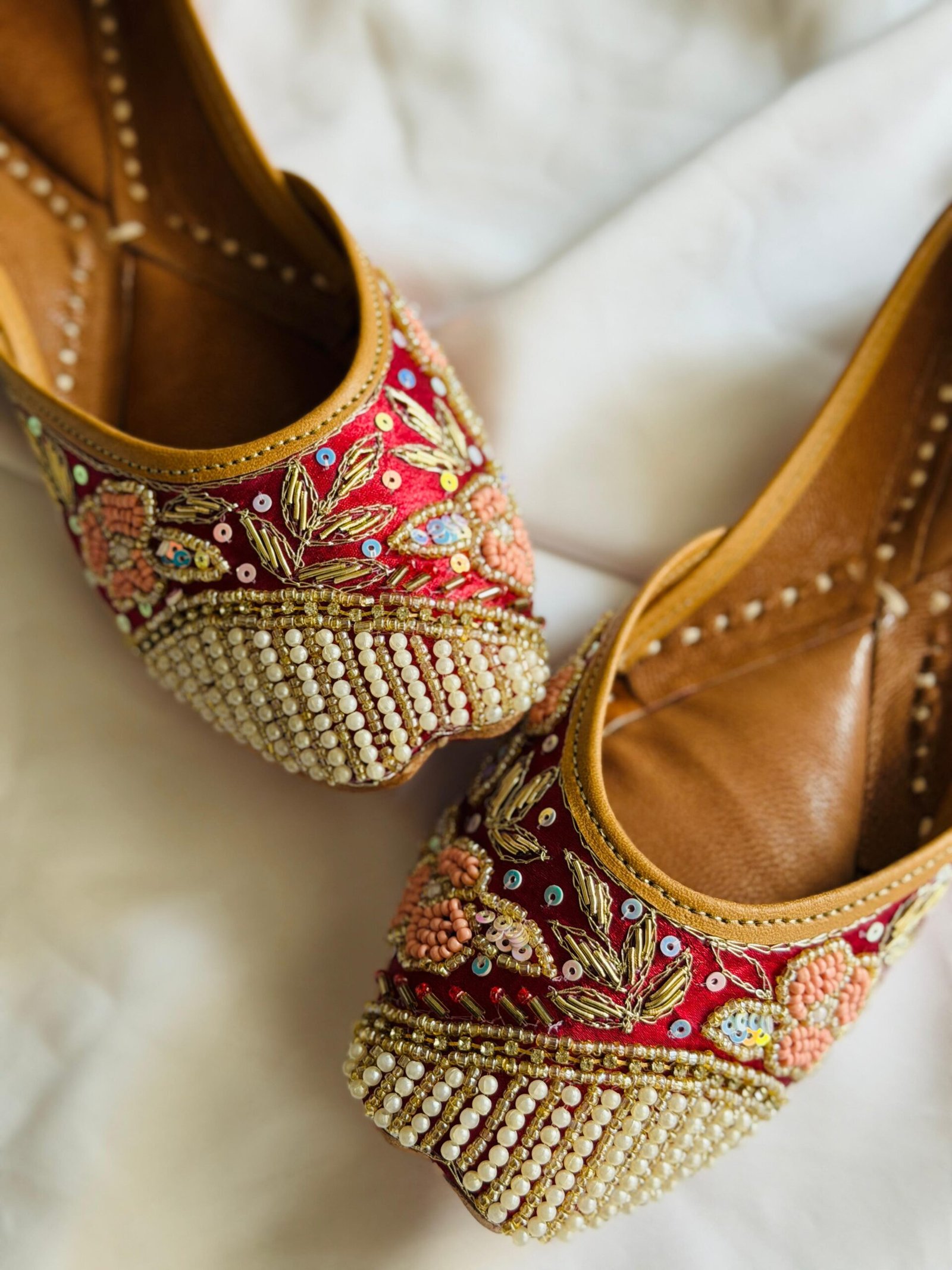 Beautiful handcrafted Caspio RED Embroidery Jutti.. Embroidery Jutti. Embroidery Jutti . Embroidery leather Jutti Embroidery Beed work wedding juttis.