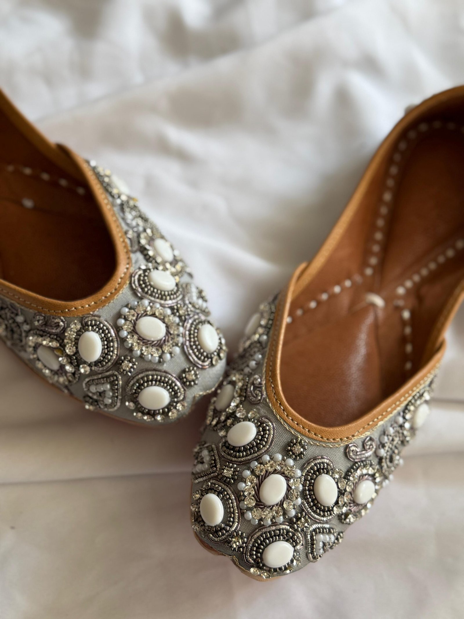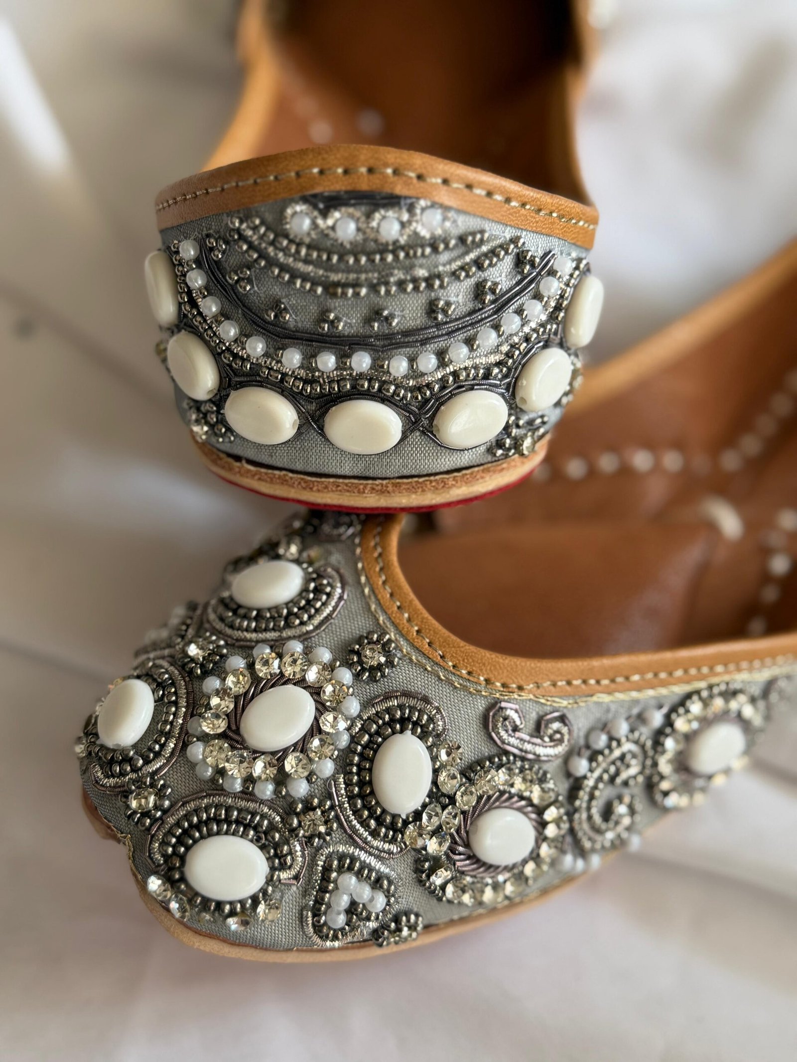 Beautiful handcrafted Sand Stone Grey Embroidery Jutti. Embroidery Jutti . Embroidery leather Jutti Embroidery Beed work wedding juttis.